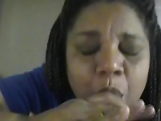 Black babe sucking a big white cock and swallowing his cum